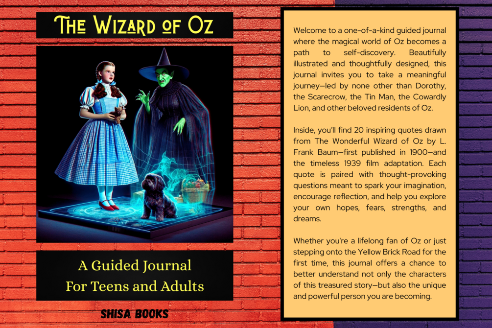 Inside, you’ll find 20 inspiring quotes drawn from The Wonderful Wizard of Oz by L. Frank Baum—first published in 1900—and the timeless 1939 film adaptation. Each quote is paired with thought-provoking questions meant to spark your imagination, encourage reflection, and help you explore your own hopes, fears, strengths, and dreams.